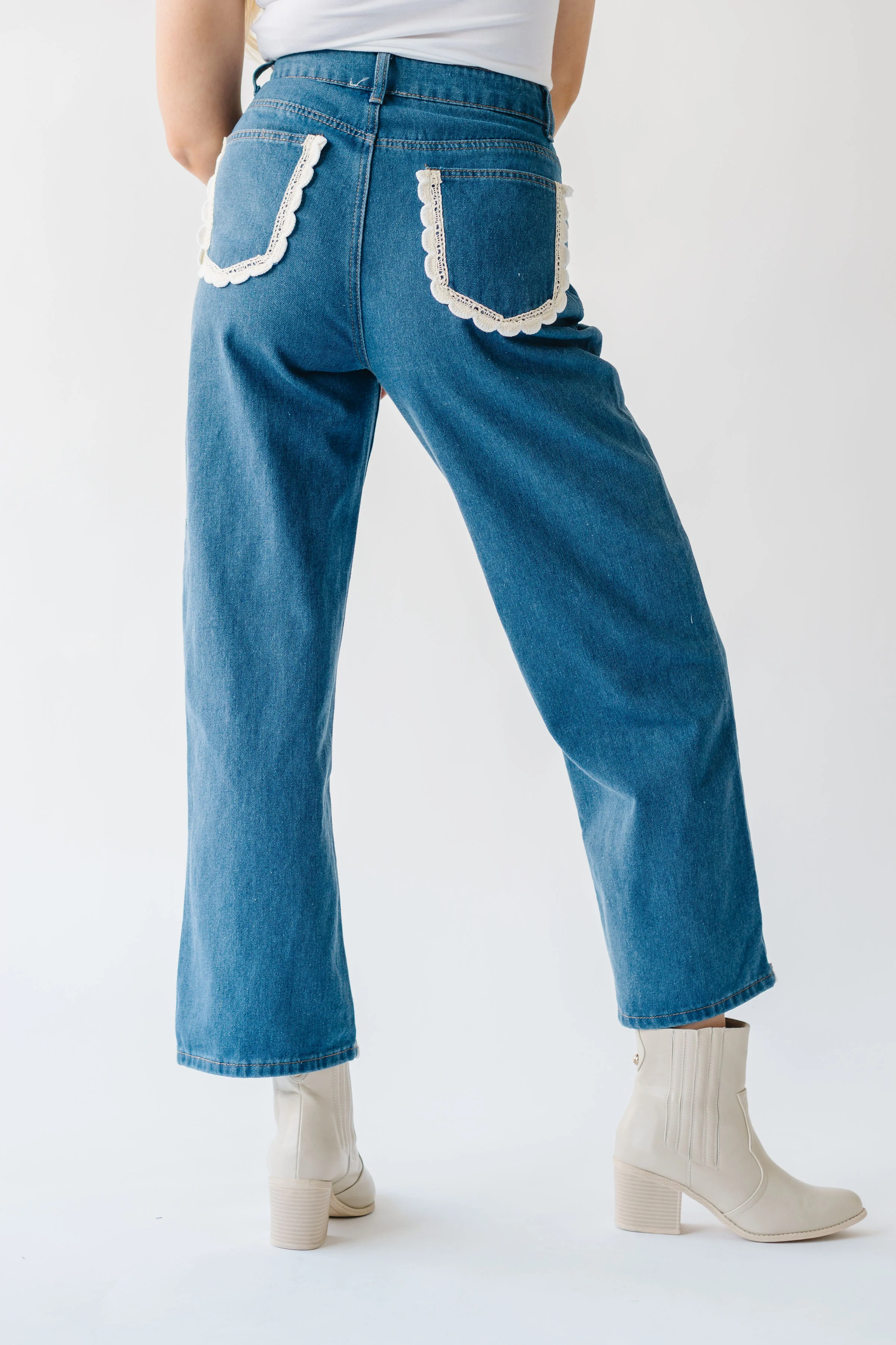 The perfect jeans for the fashion-forward adventurer! Our Texico Crochet Trim Jean in Denim features intricate crochet detailing along the hemline, adding a unique touch to a classic denim design. With a comfortable fit and flattering silhouette, you'll be ready for any journey in style!